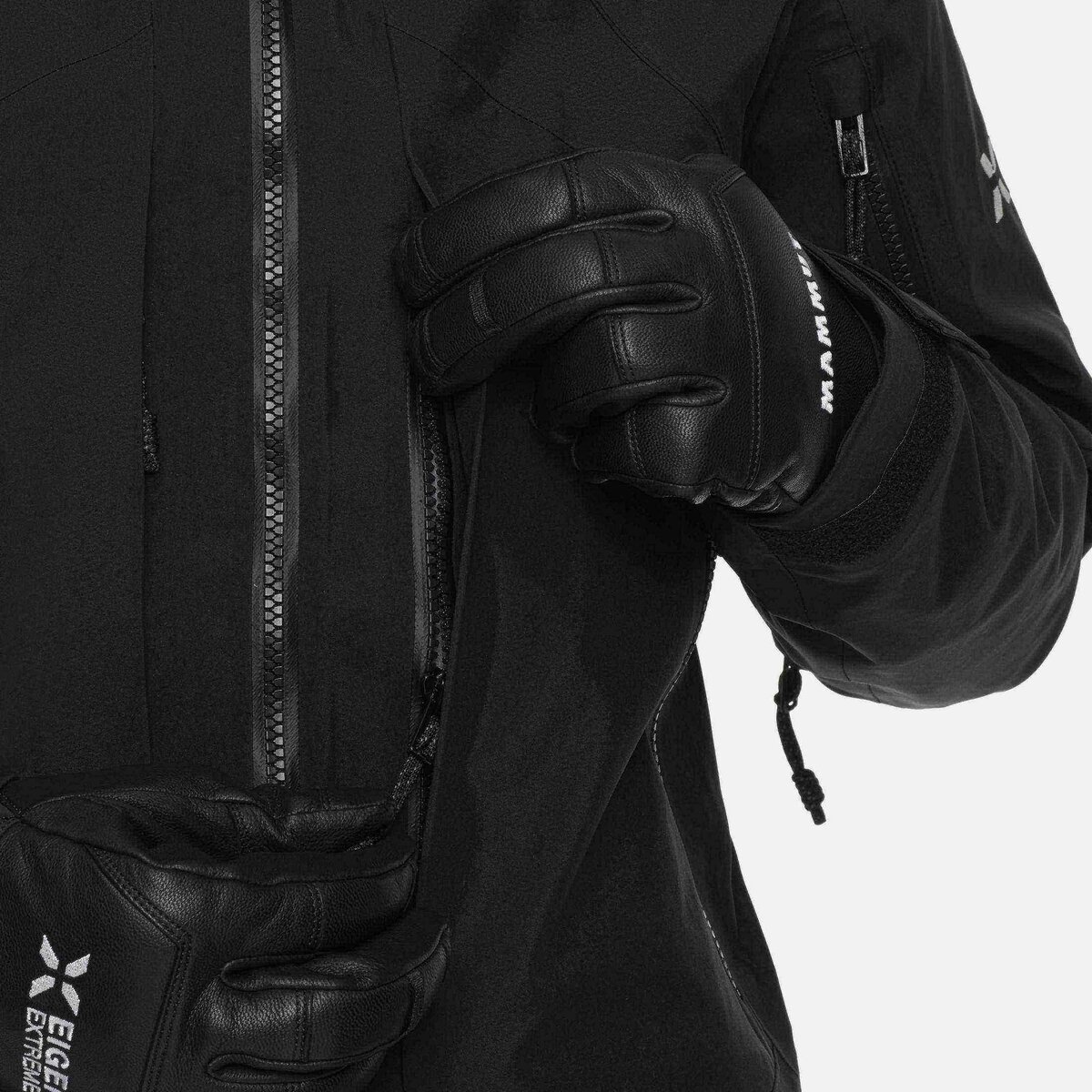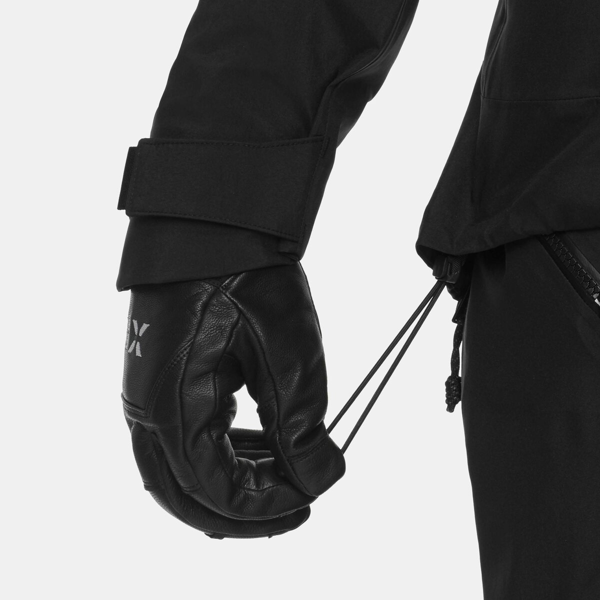 - Profilowane mankiety z regulacją na rzepy i przedłużeniem zakładki grosgrain dla lepszej użyteczności w rękawiczkach